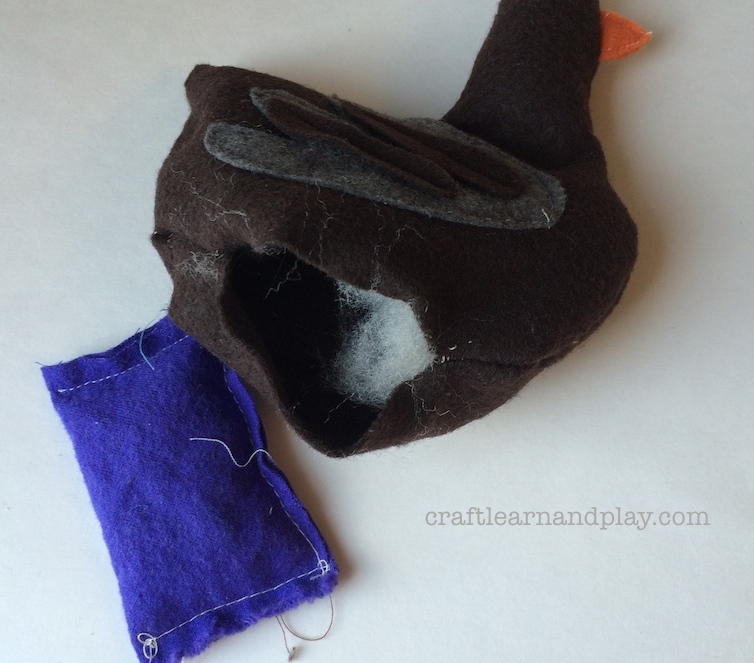 After I stitch all pieces with sewing machine I left little opening at bottom to stuff our felt hen. For stuffing I used wool and rice filling. I had one ‘rice pillow’ left from DIY baby Waldorf doll, the one that was to big to fit the doll. I am happy I could used it for this project.
